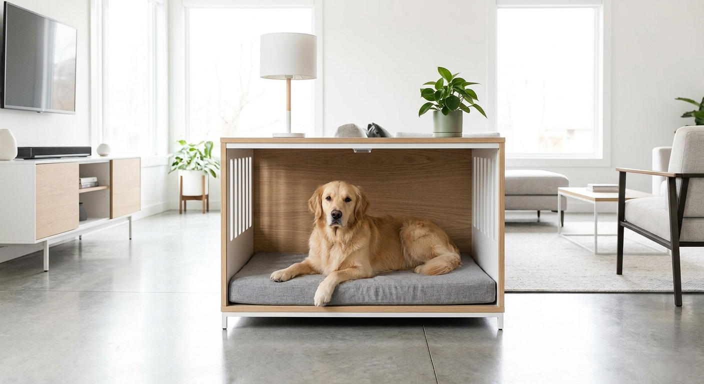 Furniture-style crates, elevated feeders, and design-forward dog essentials for homes that still want to look like home.